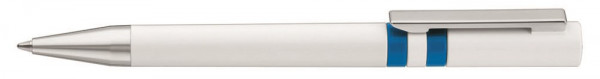 Drehkugelschreiber mit gedeckt glänzendem Gehäuse in uni weiß. Eingelassene Ringe und Stopfen im Oberteil unifarben. Metallclip und Spitze in silber glänzend.