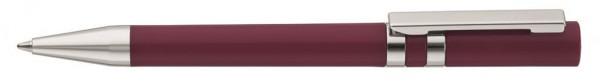 Drehkugelschreiber mit uni gedeckt glänzendem Gehäuse. Eingelassene Ringe und Stopfen im Oberteil sowie Metallclip und Spitze in silber glänzend.