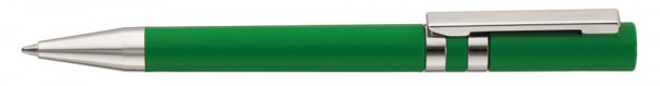 Drehkugelschreiber mit uni gedeckt glänzendem Gehäuse. Eingelassene Ringe und Stopfen im Oberteil sowie Metallclip und Spitze in silber glänzend. Minentype: uma Jumbo Refill Minenfarbe: blau