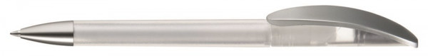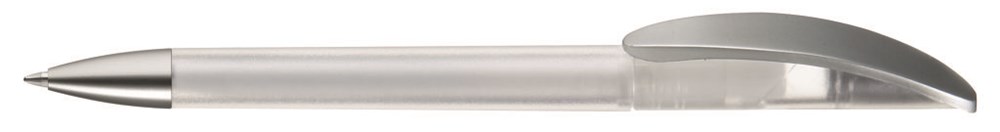 Drehkugelschreiber mit transparent gefrostetem oder gedecktem Gehäuse. Matt silberner Bogenclip und schwerer, matt verchromter Metallspitze.