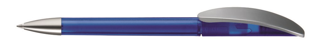 Drehkugelschreiber mit transparent gefrostetem oder gedecktem Gehäuse. Matt silberner Bogenclip und schwerer, matt verchromter Metallspitze.