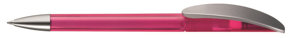 Drehkugelschreiber mit transparent gefrostetem oder gedecktem Gehäuse. Matt silberner Bogenclip und schwerer, matt verchromter Metallspitze.