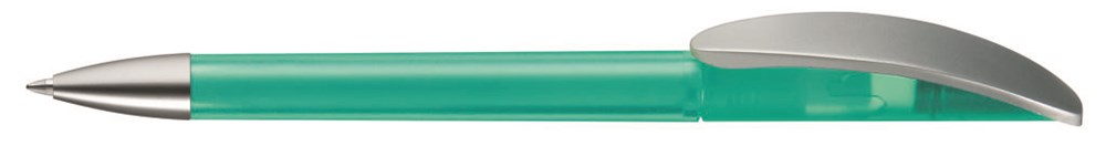 Drehkugelschreiber mit transparent gefrostetem oder gedecktem Gehäuse. Matt silberner Bogenclip und schwerer, matt verchromter Metallspitze.