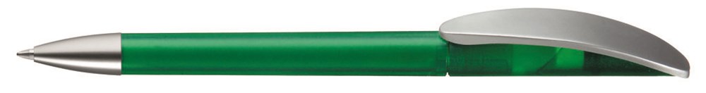 Drehkugelschreiber mit transparent gefrostetem oder gedecktem Gehäuse. Matt silberner Bogenclip und schwerer, matt verchromter Metallspitze.