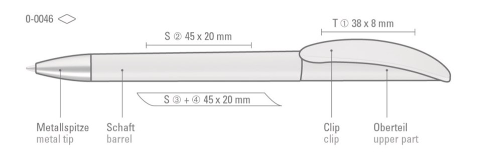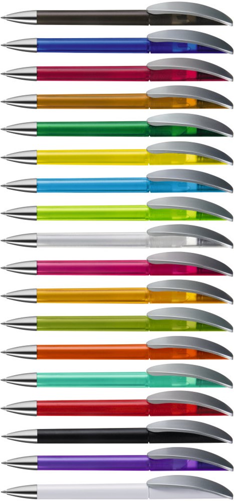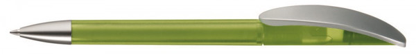 Drehkugelschreiber mit transparent gefrostetem oder gedecktem Gehäuse. Matt silberner Bogenclip und schwerer, matt verchromter Metallspitze.