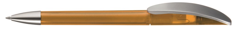 Drehkugelschreiber mit transparent gefrostetem oder gedecktem Gehäuse. Matt silberner Bogenclip und schwerer, matt verchromter Metallspitze.