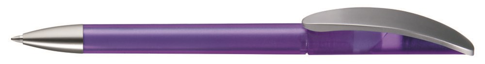 Drehkugelschreiber mit transparent gefrostetem oder gedecktem Gehäuse. Matt silberner Bogenclip und schwerer, matt verchromter Metallspitze.