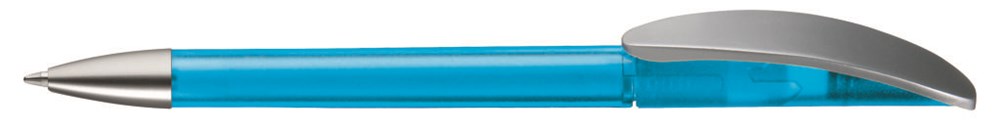 Drehkugelschreiber mit transparent gefrostetem oder gedecktem Gehäuse. Matt silberner Bogenclip und schwerer, matt verchromter Metallspitze.