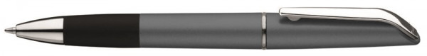 Drehkugelschreiber mit Gummigriffzone in schwarz und Gehäuse im Metallic-Look. Metallclip, Zierring und Metallspitze in silber glänzend.