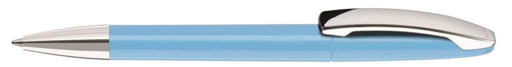 Drehkugelschreiber mit gedeckt glänzendem Gehäuse, Metallclip und Spitze glanzverchromt.
