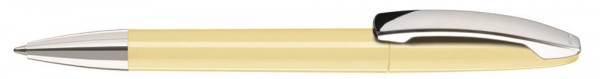 Drehkugelschreiber mit gedeckt glänzendem Gehäuse, Metallclip und Spitze glanzverchromt.