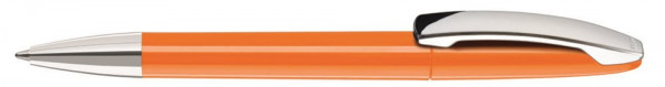 Drehkugelschreiber mit gedeckt glänzendem Gehäuse, Metallclip und Spitze glanzverchromt.