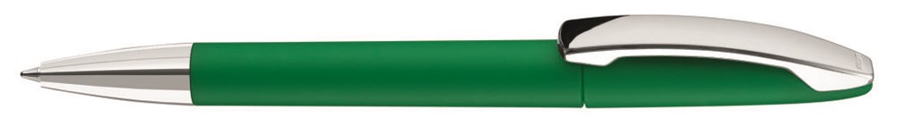 Drehkugelschreiber mit farbigem Softtouch-Gehäuse, silber glänzender Spitze und glänzendem Metallclip.