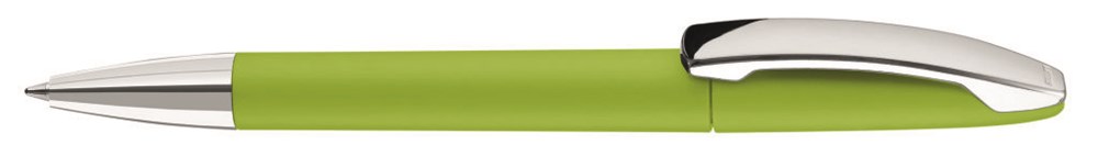 Drehkugelschreiber mit farbigem Softtouch-Gehäuse, silber glänzender Spitze und glänzendem Metallclip.
