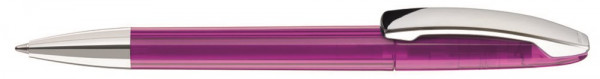 Drehkugelschreiber mit transparent glänzendem Gehäuse, Metallclip und Spitze glanzverchromt.