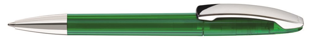 Drehkugelschreiber mit transparent glänzendem Gehäuse, Metallclip und Spitze glanzverchromt.