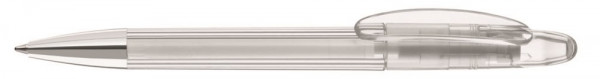 Drehkugelschreiber mit transparent glänzendem Gehäuse und silber glänzender Spitze.