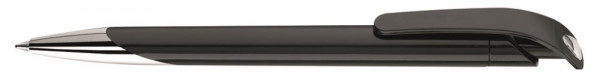 Druckkugelschreiber mit glänzend gedecktem Gehäuse, silber glänzender Spitze und Clipstopfen.