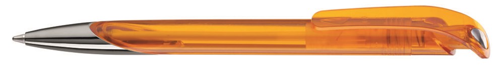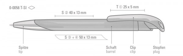 Druckkugelschreiber mit glänzend transparentem Gehäuse, silber glänzender Spitze und Clipstopfen.