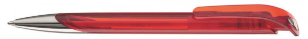 Druckkugelschreiber mit glänzend transparentem Gehäuse, silber glänzender Spitze und Clipstopfen.