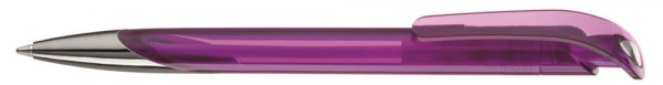 Druckkugelschreiber mit glänzend transparentem Gehäuse, silber glänzender Spitze und Clipstopfen.