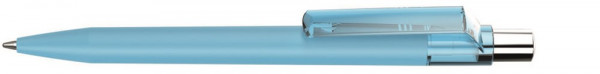 Druckkugelschreiber mit Softtouch-Schaft, transparent glänzendem Clip, silber glänzendem Drücker mit farbigem Stopfen.