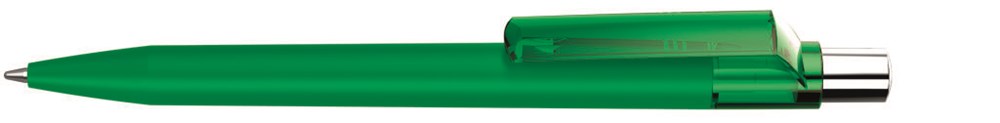 Druckkugelschreiber mit Softtouch-Schaft, transparent glänzendem Clip, silber glänzendem Drücker mit farbigem Stopfen.