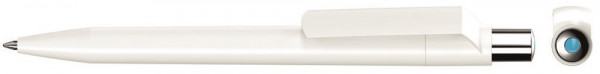 Druckkugelschreiber unifarben glänzend gedeckt weiß mit silber glänzendem Drücker und farbigem Stopfen.