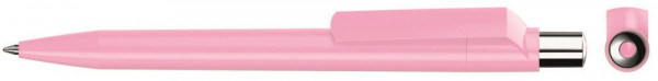Druckkugelschreiber mit gedeckt glänzendem Gehäuse, silber glänzendem Drücker mit farbigem Stopfen.