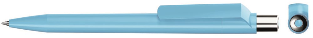 Druckkugelschreiber mit gedeckt glänzendem Gehäuse, silber glänzendem Drücker mit farbigem Stopfen.