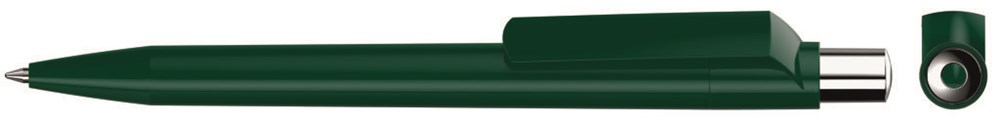 Druckkugelschreiber mit gedeckt glänzendem Gehäuse, silber glänzendem Drücker mit farbigem Stopfen.