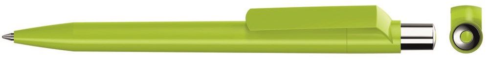 Druckkugelschreiber mit gedeckt glänzendem Gehäuse, silber glänzendem Drücker mit farbigem Stopfen.