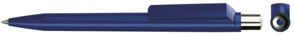 Druckkugelschreiber mit gedeckt glänzendem Gehäuse, silber glänzendem Drücker mit farbigem Stopfen.