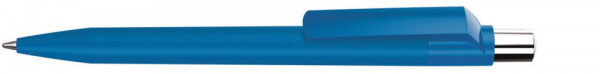 Druckkugelschreiber mit Softtouch-Schaft, gedeckt glänzendem Clip, silber glänzendem Drücker mit farbigem Stopfen.