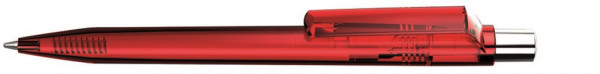 Druckkugelschreiber mit transparent glänzendem Gehäuse, silber glänzendem Drücker mit farbigem Stopfen.