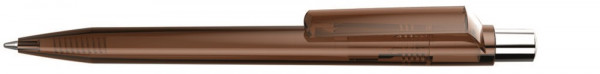 Druckkugelschreiber mit transparent glänzendem Gehäuse, silber glänzendem Drücker mit farbigem Stopfen.