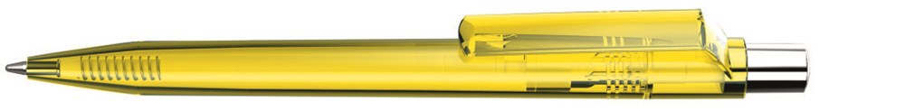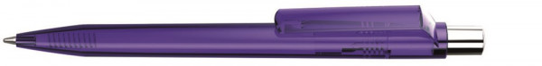 Druckkugelschreiber mit transparent glänzendem Gehäuse, silber glänzendem Drücker mit farbigem Stopfen.