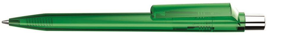 Druckkugelschreiber mit transparent glänzendem Gehäuse, silber glänzendem Drücker mit farbigem Stopfen.