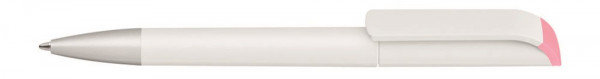 Drehkugelschreiber mit gedeckt mattem Gehäuse in weiß mit farbig glänzendem Stopfen und silber matter Spitze. Ab 2.000 Stück kann das Modell farblich kombiniert werden.