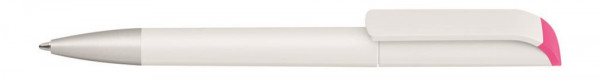 Drehkugelschreiber mit gedeckt mattem Gehäuse in weiß mit farbig glänzendem Stopfen und silber matter Spitze. Ab 2.000 Stück kann das Modell farblich kombiniert werden.