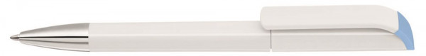 Drehkugelschreiber mit gedeckt glänzendem Gehäuse in weiß mit farbigen Stopfen und Spitze glanzverchromt. Ab 2.000 Stück kann das Modell farblich kombiniert werden.