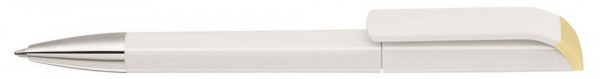 Drehkugelschreiber mit gedeckt glänzendem Gehäuse in weiß mit farbigen Stopfen und Spitze glanzverchromt. Ab 2.000 Stück kann das Modell farblich kombiniert werden.
