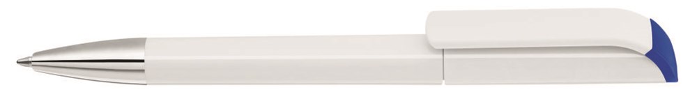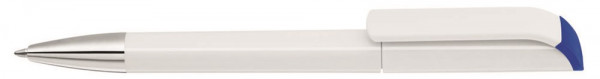 Drehkugelschreiber mit gedeckt glänzendem Gehäuse in weiß mit farbigen Stopfen und Spitze glanzverchromt. Ab 2.000 Stück kann das Modell farblich kombiniert werden.