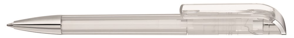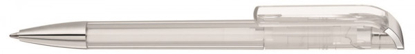 Drehkugelschreiber mit transparent glänzendem Gehäuse, Stopfen und Spitze glanzverchromt.