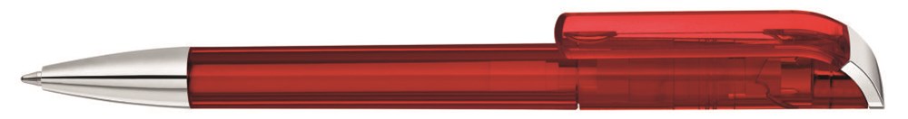 Drehkugelschreiber mit transparent glänzendem Gehäuse, Stopfen und Spitze glanzverchromt.