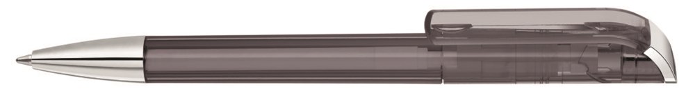 Drehkugelschreiber mit transparent glänzendem Gehäuse, Stopfen und Spitze glanzverchromt.