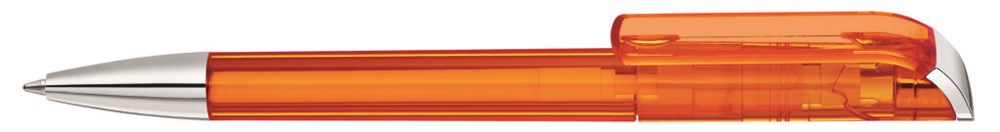 Drehkugelschreiber mit transparent glänzendem Gehäuse, Stopfen und Spitze glanzverchromt.