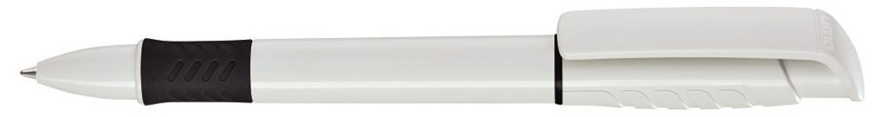 Druckkugelschreiber mit gedeckt glänzendem Gehäuse in weiß, Griffzone und Zierring unifarben bzw. komplett unifarben gedeckt glänzend schwarz. Ab 2.000 Stück kann das Modell farblich kombiniert werden.