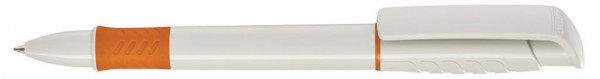 Druckkugelschreiber mit gedeckt glänzendem Gehäuse in weiß, Griffzone und Zierring unifarben bzw. komplett unifarben gedeckt glänzend schwarz. Ab 2.000 Stück kann das Modell farblich kombiniert werden.