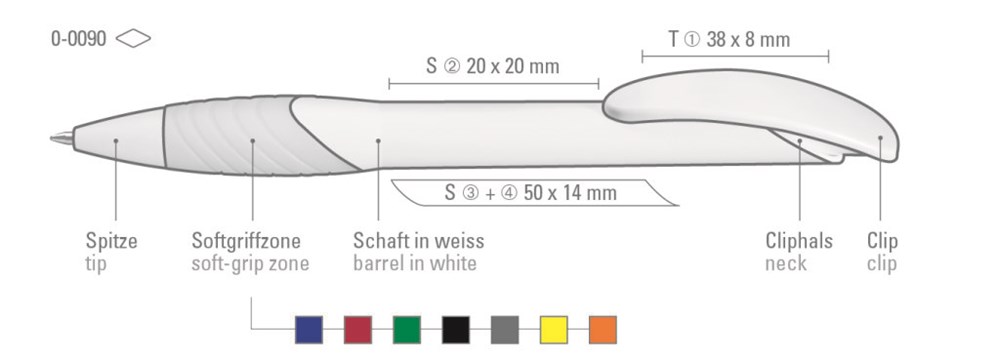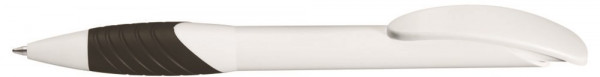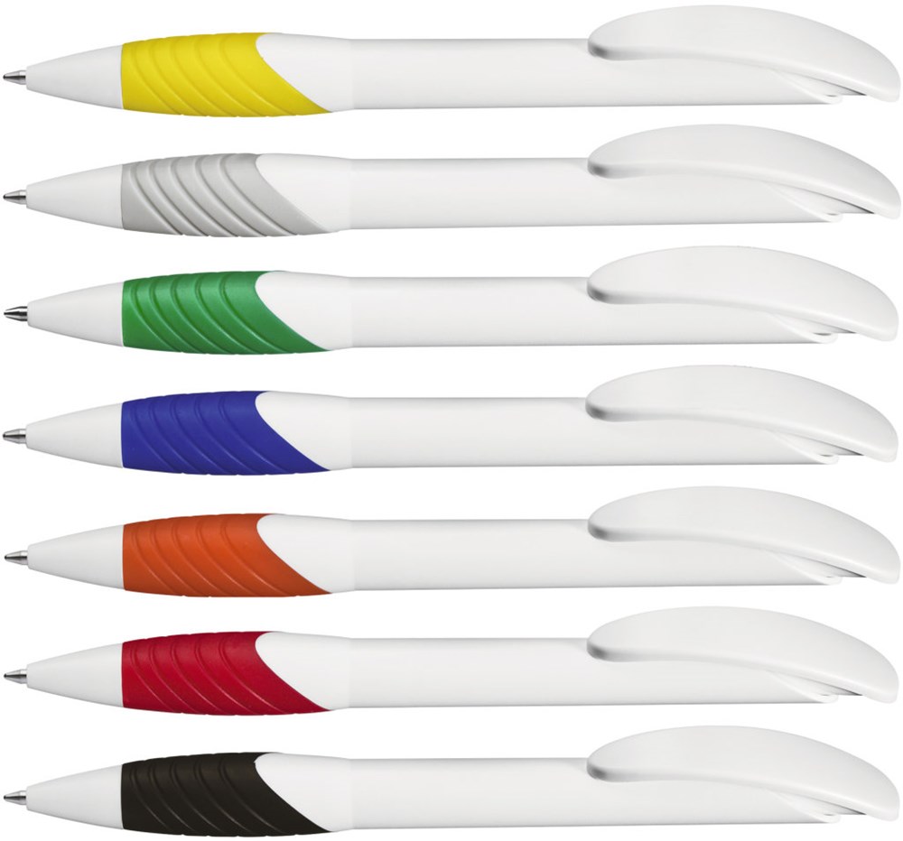 Druckkugelschreiber mit weißem matten Gehäuse und Bogenclipdrücker. Ergonomische Gummigriffzone in gedeckten Farben.